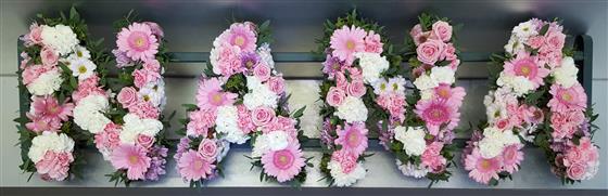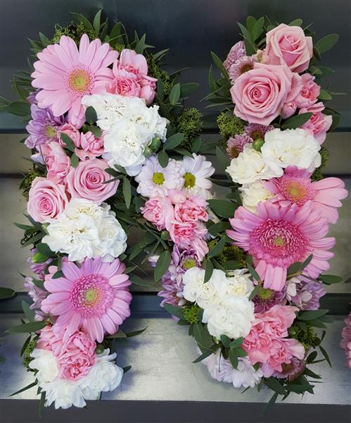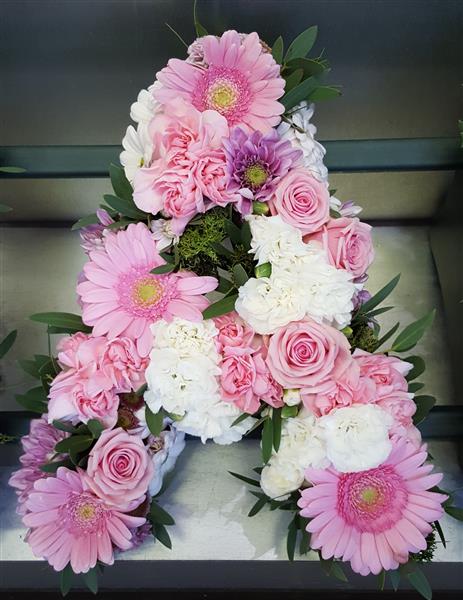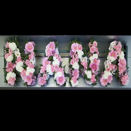 NANA funeral flowers tribute in seasonal pink and white coloured shades. Only the freshest pink and white flowers from Holland are used in this floral NANA tribute.