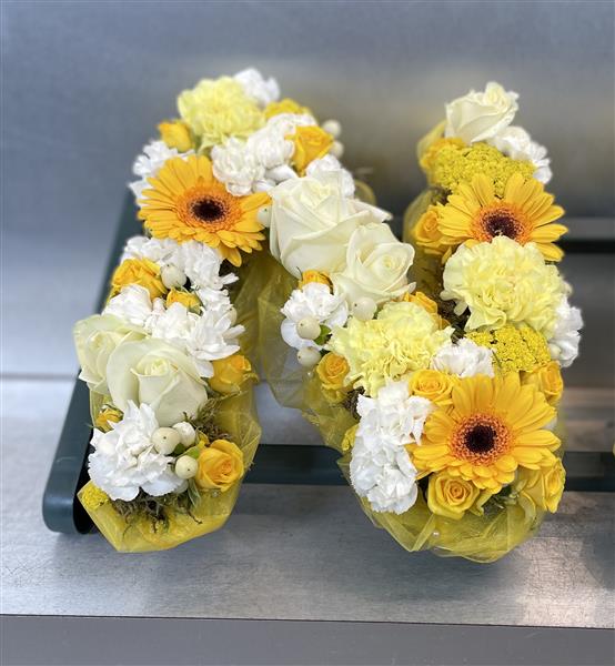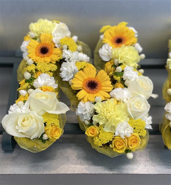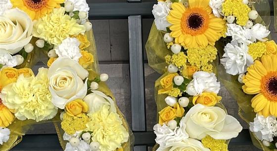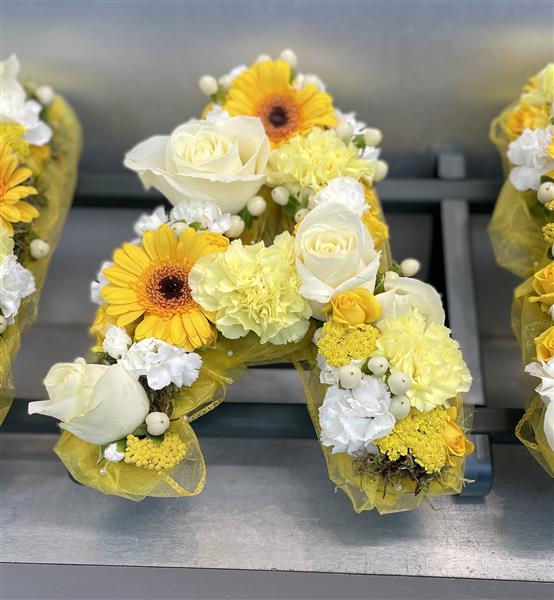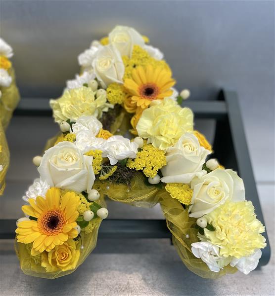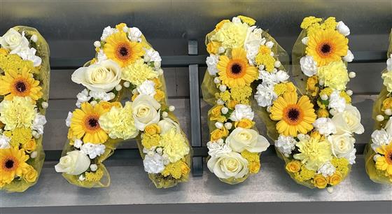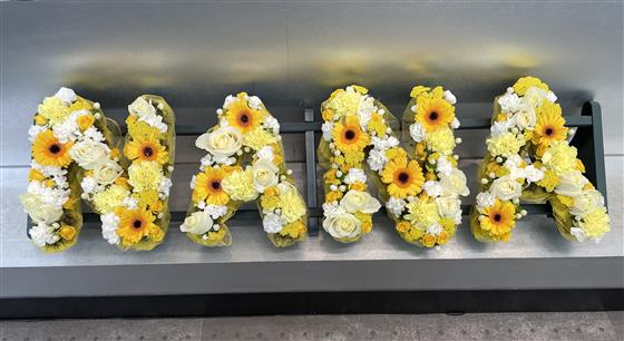NANA funeral flowers tribute in seasonal yellow and white coloured flowers. Only the freshest white and yellow flowers from Holland are used in this floral NANA tribute.