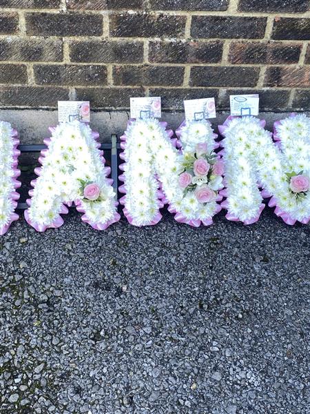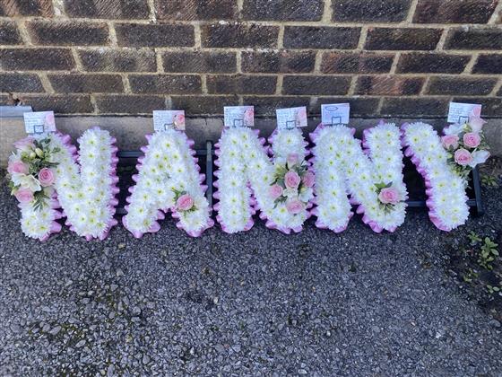This NANNY funeral flowers tribute is based in white Double Chrysanthemums. Choose your colour ribbon and the floral sprays. A perfect and fitting floral tribute for a much loved Nanny.