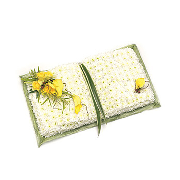 The Open Prayer Book tribute is a graceful floral arrangement symbolising faith, remembrance and love. Expertly handcrafted by our florists using fresh seasonal flowers, it features an open book design ideal for religious or spiritual funeral services. A meaningful and elegant way to honour a loved one’s memory. Rays Florist offers sensitive and reliable delivery across most GU postcodes for all funeral and memorial arrangements.