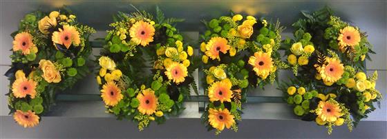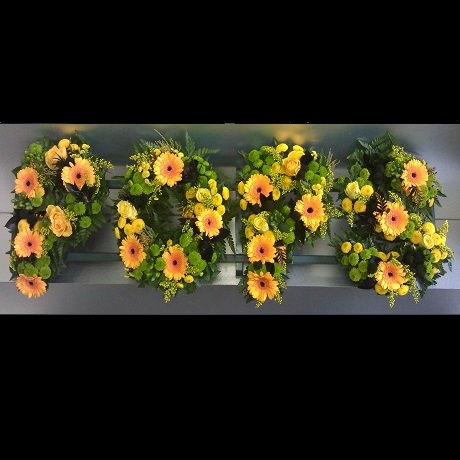 POPS funeral flowers tribute in seasonal yellow and lime coloured shades. Only the freshest lime and yellow flowers from Holland are used in this floral POPS tribute.