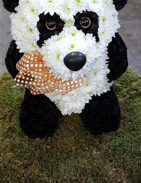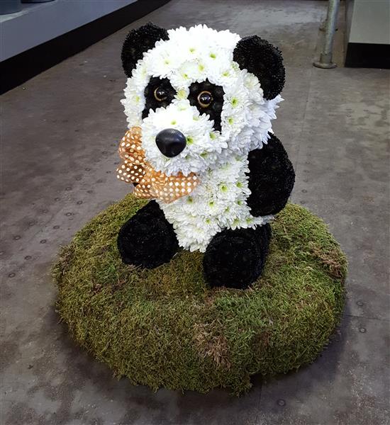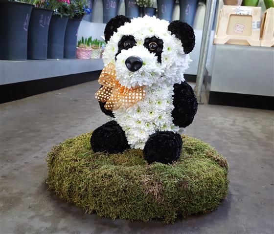 Flowers for a funeral in the shape of a Panda Bear. The 3D Panda is sitting on a bed of green moss and is made from Chrysanthemums, some naturally white, the others are sprayed black with floral spray paint.
