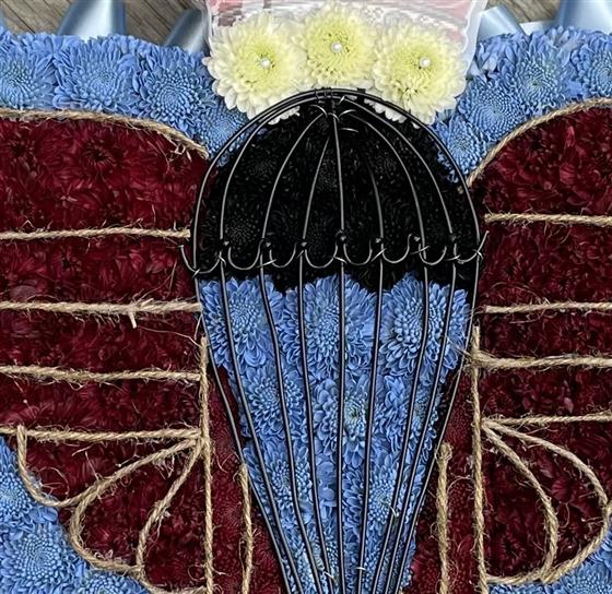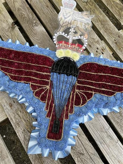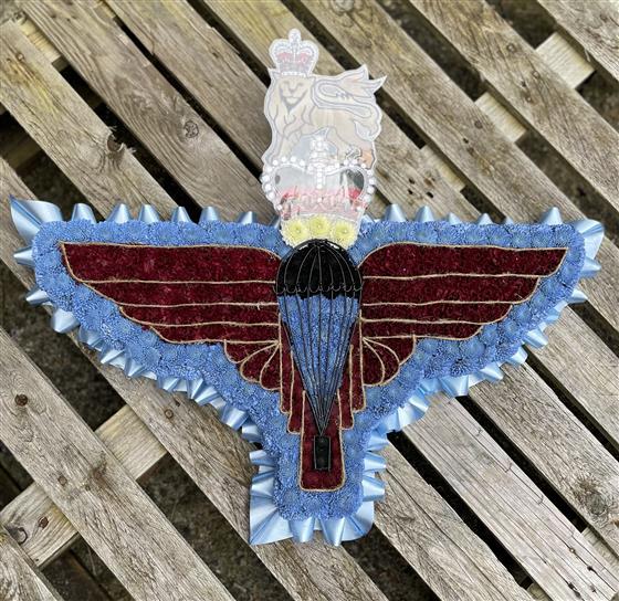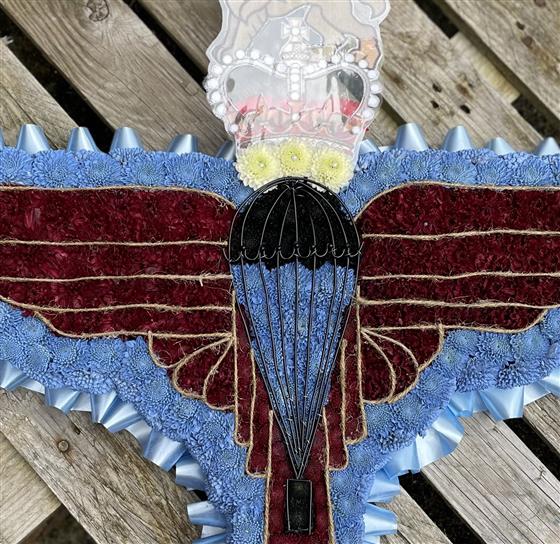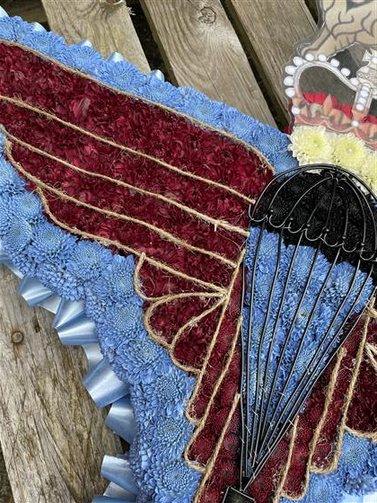 Parachute Regiment Badge shape made in flowers. Funeral flower tribute for the Parachute regiment. Burgundy and blue colours represent the Para colours.