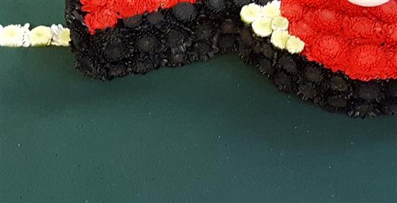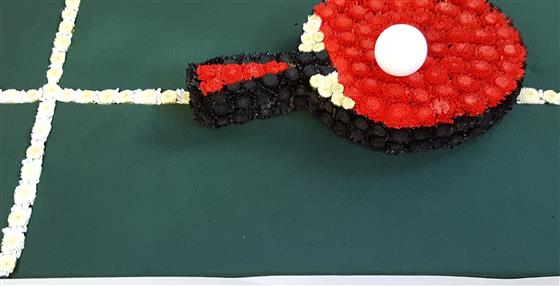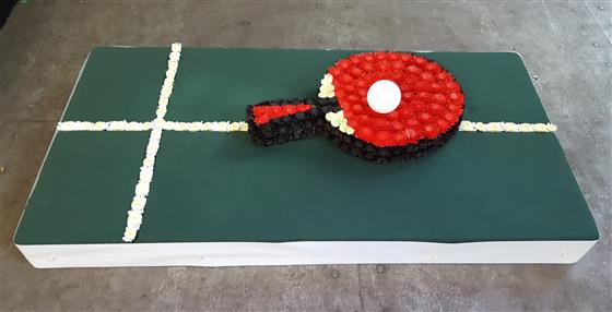 This simple yet striking tribute was designed for a keen Table Tennis player. It depicts the smooth green Table Tennis table with line markings and a real Ping Pong ball placed on a hand crafted, Stallion Chrysanthemum based Table Tennis bat.
