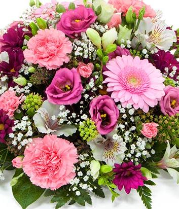 A beautiful pink posy design with pink Germini, deep pink chrysanthemum, pink carnation, scented freesia and gypsophila. Flowers arranged using Oasis foam in a posy dish.