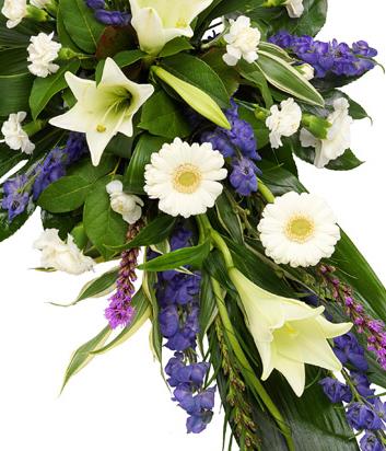 A gorgeous white and purple single ended spray. White Longiflorum Lilies, Germini and Carnations are interspersed with purple Aconitum and Liatris. Luscious green foliage completes the design beautifully.