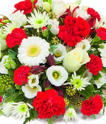 Classic red and white colours combine in this elegant posy, with white roses, white Germini, white chrysanthemum, red carnations, white lisianthus and red spray carnations. Flowers arranged using Oasis foam in a posy dish.