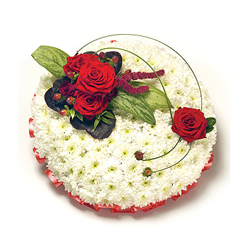 A white Chrysanthemum based posy with red ribbon edging, complete with red & green flower spray including Roses.