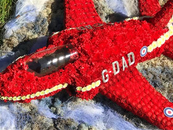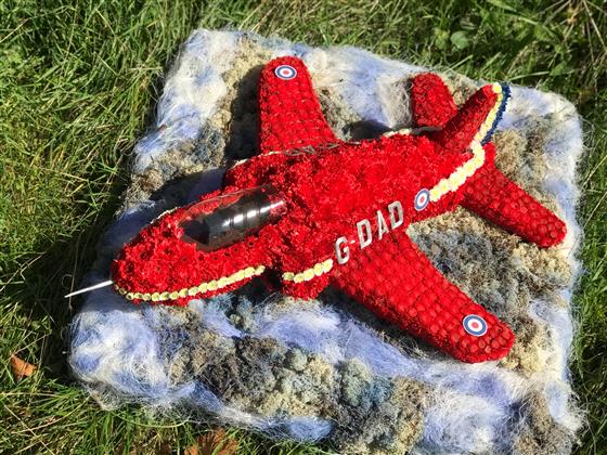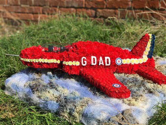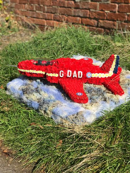 A 3D Hawk aeroplane as used by the Red Arrows aerial display team. This bespoke funeral flowers tribute has been created for a funeral. The red arrows plane comes complete in red arrows livery, colours and badges. The plane is mounted on a 2ft x 2ft base representing the sky so that the red arrows plane is shown in flight.