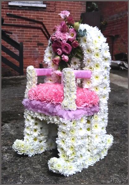 Our Rocking Chair 3D Floral Tribute is a stunning, handcrafted arrangement symbolising comfort, rest, and cherished memories. Carefully constructed with fresh white chrysanthemums and a natural log base, this three-dimensional tribute offers a unique and personal farewell. Created with expert care by Rays Florist and available for local delivery across most GU postcodes with advanced notice.
