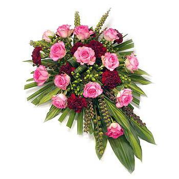 A beautiful single ended spray of pink roses & red carnations combined with variegated foliage and Palm Leaves.