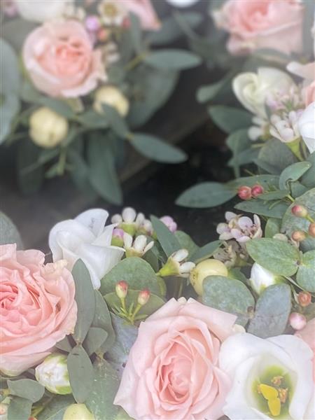 Introducing our exquisite Open Heart Floral Tribute, a beautifully crafted arrangement designed to honour your loved one. This elegant tribute features a harmonious blend of pristine white and soft pink flowers, including light and dark pink tones, delicate eustoma, fragrant eucalyptus and lush greenery. This tasteful piece is perfect for funerals.
