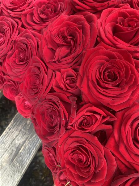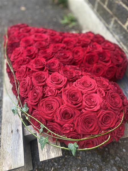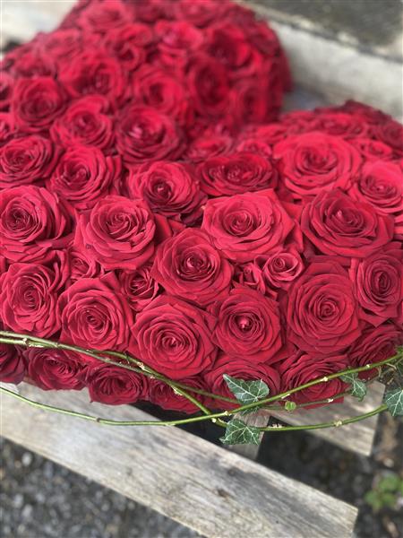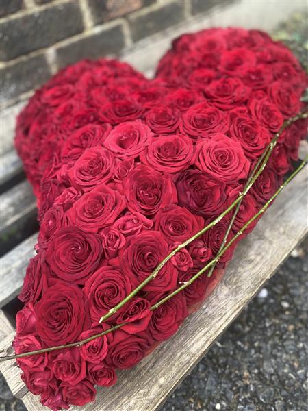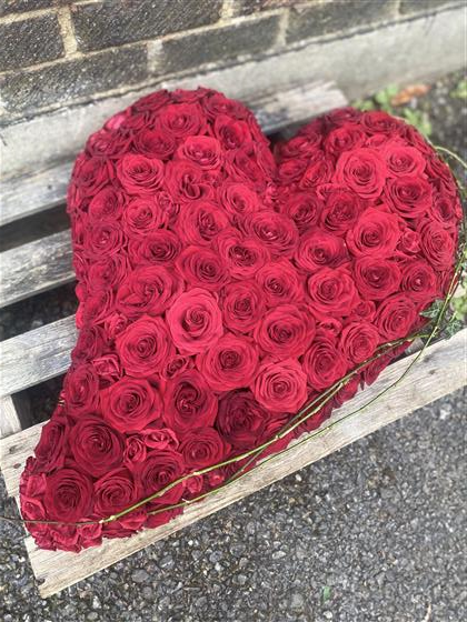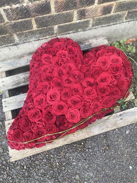 The Solid Swinging Heart Tribute from Rays Florist features a lovingly arranged, dense halo of red roses in a heart shape. Crafted using silky Red Naomi roses and lush foliage, this elegant tribute symbolises enduring love and remembrance. Delivered with care across most GU postcodes, providing a heartfelt, professional service locally.