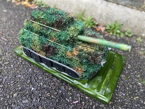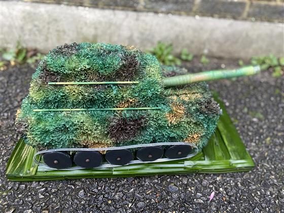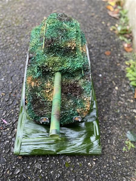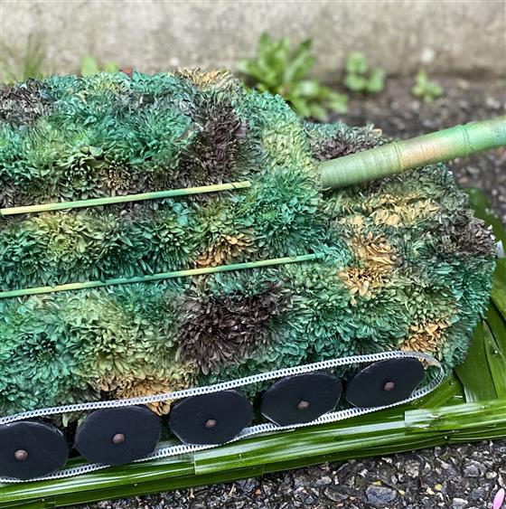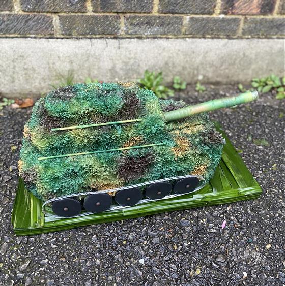 This 3D British Army tank is created using fresh flowers which have been sprayed in camouflage colours. The army tank tribute is mounted on a flat base which has been covered in green leaves. This tank is a completely hand made and bespoke funeral tribute and therefore requires at least 7 days notice.