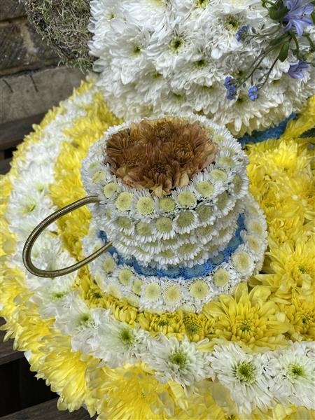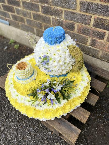 This slightly over life size replica of a china teapot and matching cup and saucer on a tray is made from a mixed Chrysanthemum varieties. Forget-me-Nots were used on the sides of the teapot and cup & saucer to look like delicate, hand painted flowers. Any colour combination can be chosen or an actual set can be replicated from photographs.