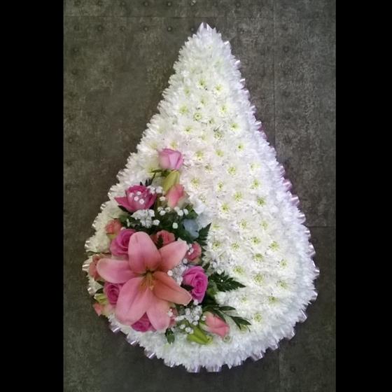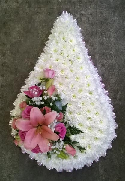 This Traditional Based Tear Drop tribute is a timeless and elegant funeral arrangement, carefully crafted with fresh white chrysanthemums and a delicate spray of seasonal flowers for a touch of colour and warmth. Perfectly designed to express sympathy and remembrance, it offers a graceful farewell for a loved one. Expertly arranged by Rays Florist, with local delivery available across most GU postcodes.