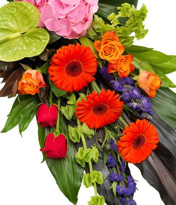A simply stunning, vibrant hand tied sheaf. Orange and cerise Roses, purple Aconitum, pink Hydrangea, green Anthurium and orange Gerbera perfectly mixed with Molucella, red Cordyline, Aspidistra and Aralia leaves, Cocculus and red Dracaena.