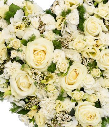 A classic white Rose and Lisianthus heart with Carnations and cream spray Roses.