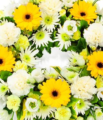 A fresh and bright yellow and white wreath, arranged by our professional florists. Containing yellow Germini, cream chrysanthemum, white carnations, white lisianthus and yellow spray carnations.