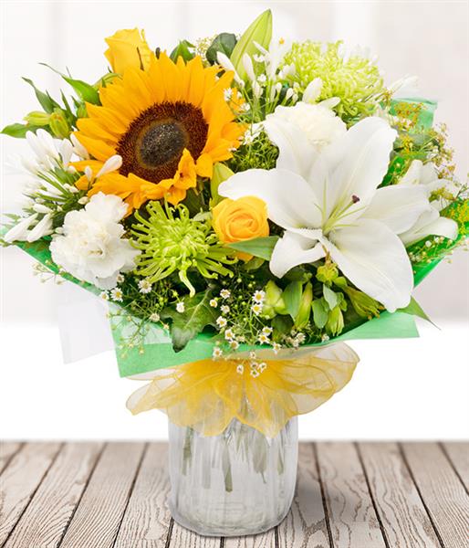 Discover the beauty of our Joy Aqua Bouquet, a stunning floral arrangement that captures the essence of summer. Featuring vibrant yellow and white hues, this delightful bouquet showcases a blend of fresh lilies, sunflowers and roses, perfect for any celebration or to brighten someone’s day. Handcrafted with care by our local florists, each bouquet ensures quality and freshness. Available in multiple sizes starting from £34.99, let the Joy Aqua Bouquet be the centerpiece of your events and delight your loved ones with a gift of flowers!